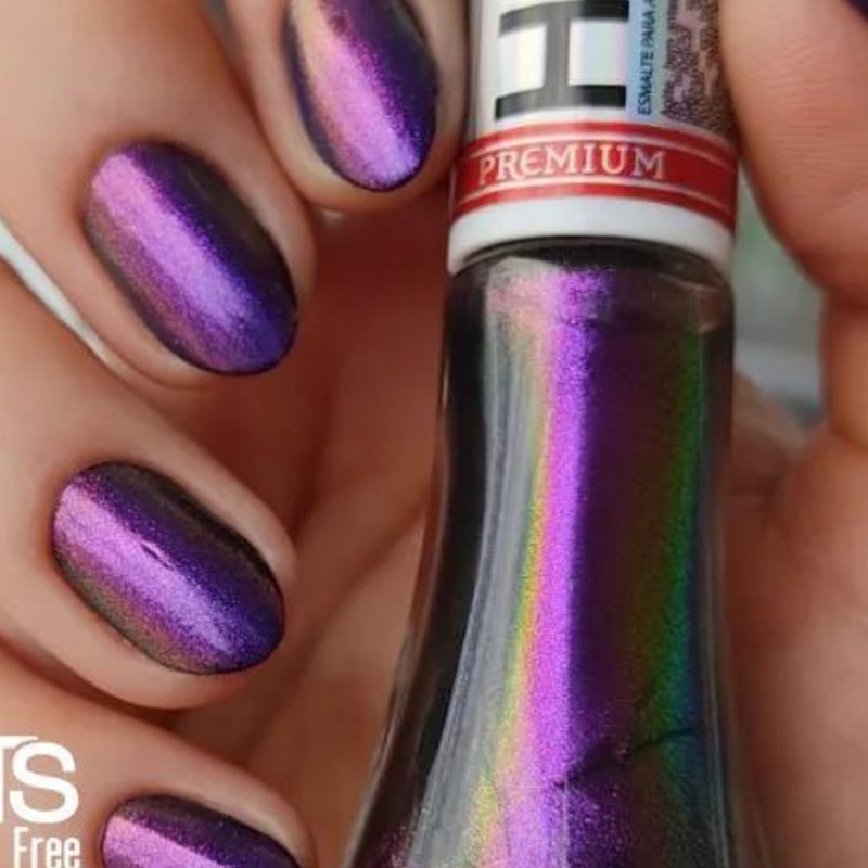 Aelo é um esmalte multichrome roxo com nuances de dourado, verde abacate, azul-escuro e rosa que vai deixar suas unhas com um efeito incrível!